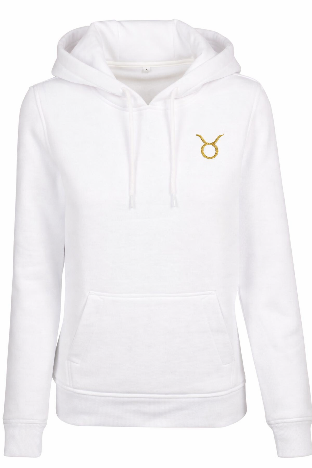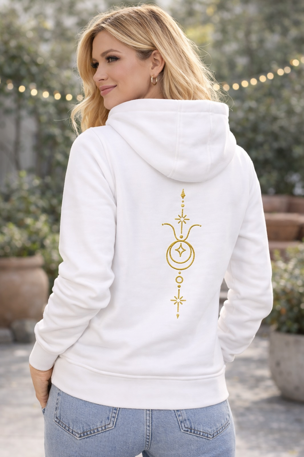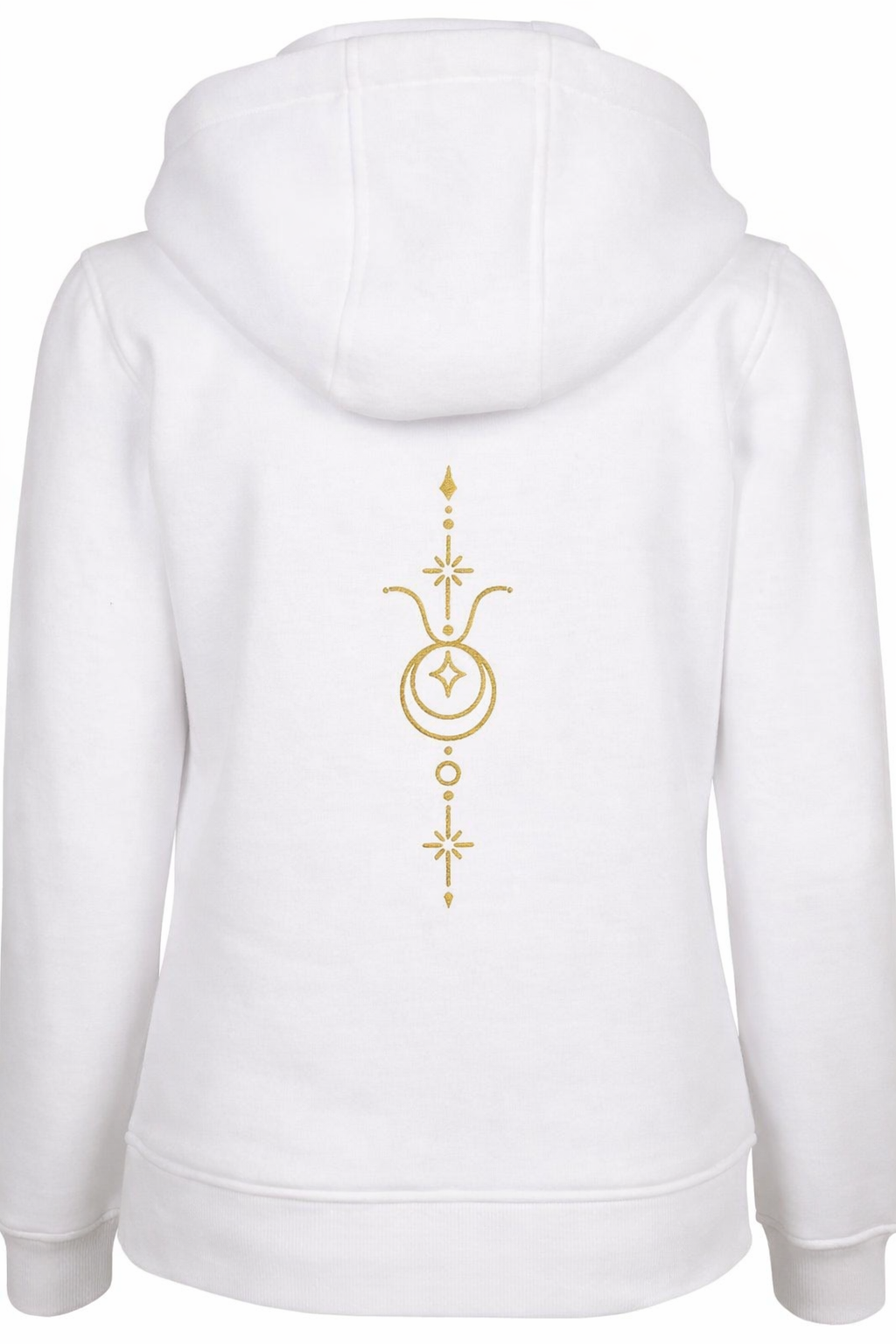 Plecy zdobi bogata, pionowa kompozycja z mistyczną aurą wykonana eleganckim złotym haftem. Centralnie umieszczony glif Byka wkomponowano w gwiezdną konstelację i motywy lunarne. Złote, mieniące się detale symbolizują Twoją planetę opiekuńczą – Wenus – czyniąc tę bluzę prawdziwym talizmanem elegancji.